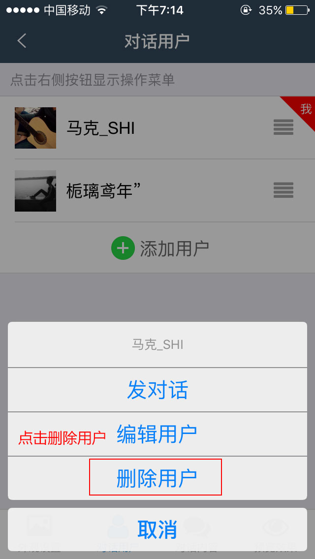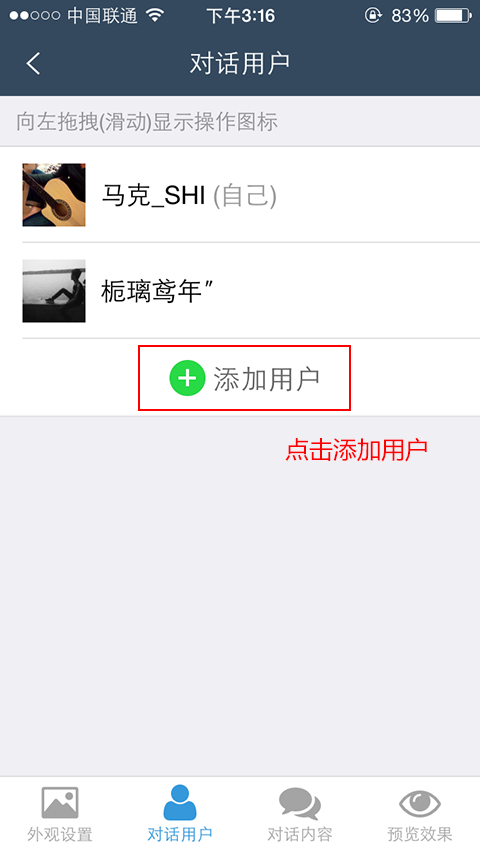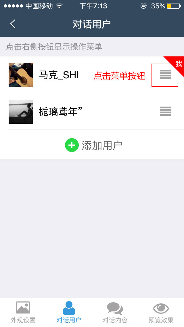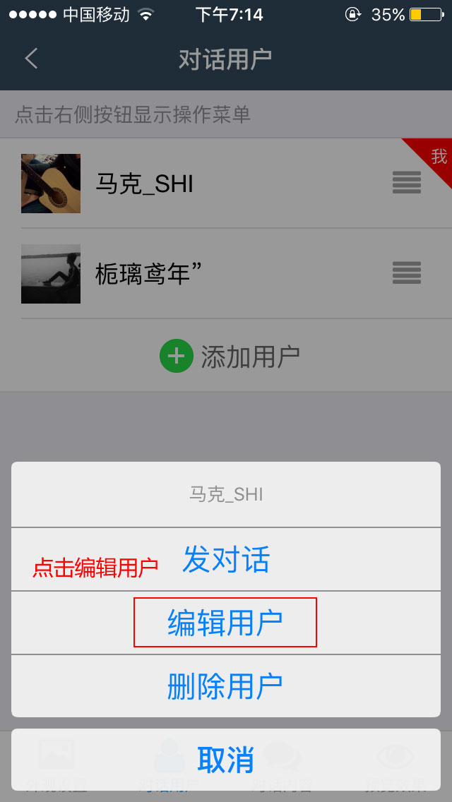 打开微信对话生成器,底部导航菜单选择“对话用户”,在对话用户里面,你可以添加、编辑、删除用户