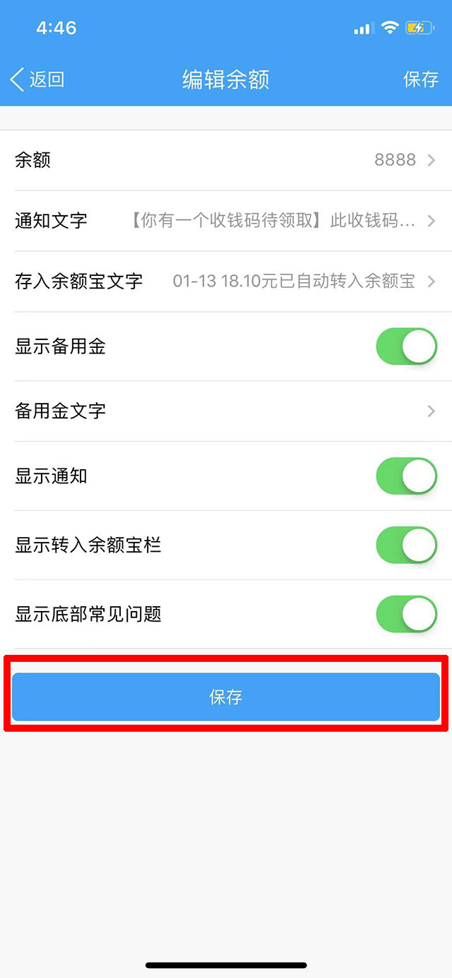 3.进入编辑页面,可以设置余额、通知文字、备用金等,设置完成后点击保存按钮