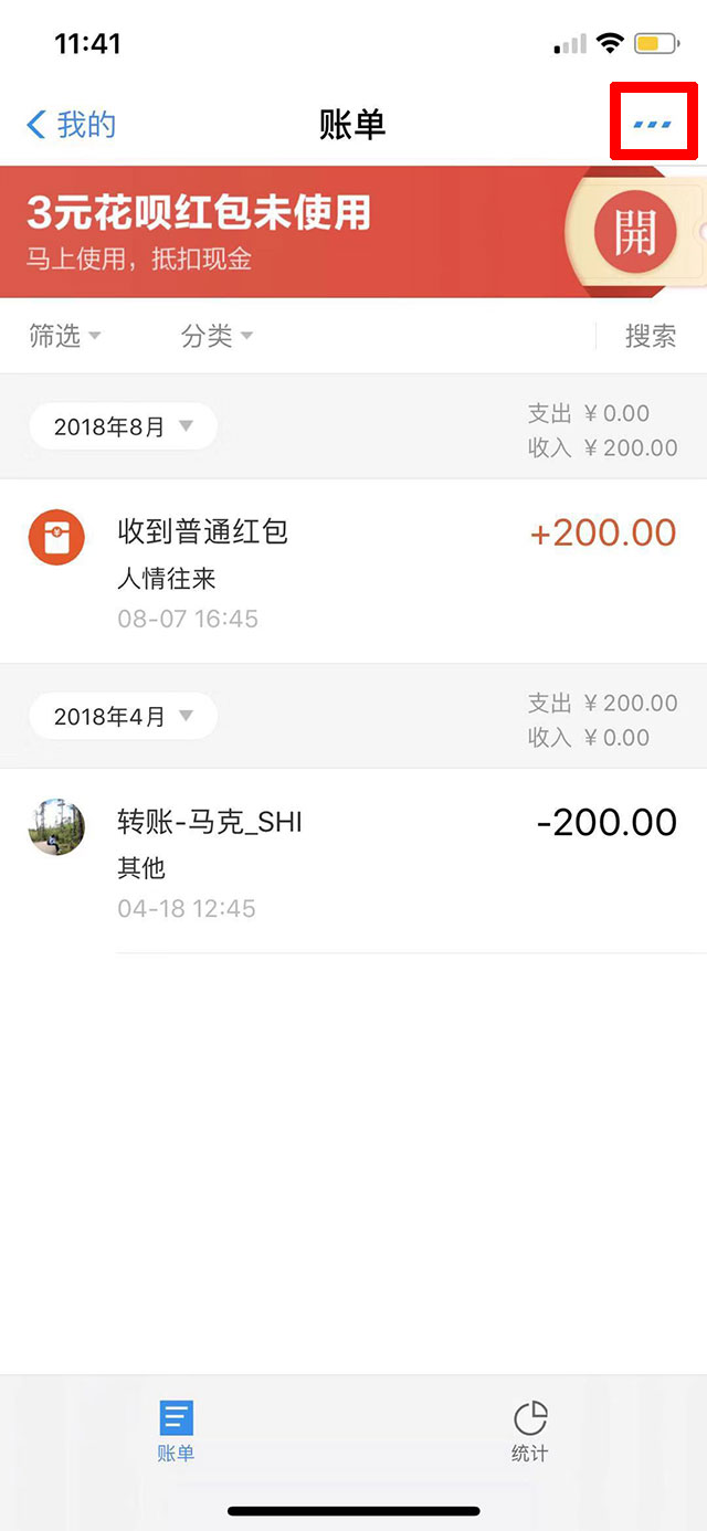 3.在弹出的菜单中选择添加转账、红包、扫码、银行卡记录(或可以随机添加账单记录)