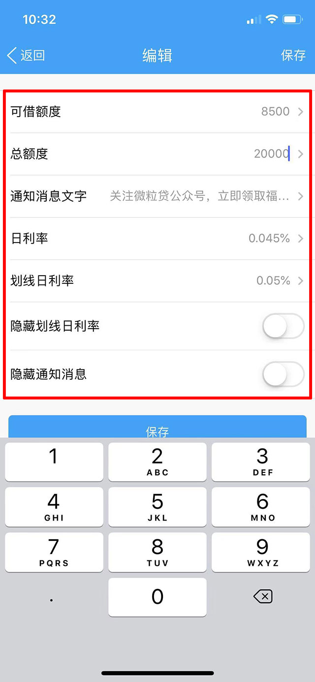 3.在编辑页面可以设置借款额度、总额度、日利率等